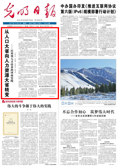 11月27日,《光明日报》以《从人口大省向人力资源大省转变——应用型人才培养的河南实践》为题,重点关注报道了我省以职业技能培训为抓手,以应用型人才培养为引领,力求从人口大省向人力资源大省、人才大省转变,为脱贫攻坚、中原更加出彩提供人才支撑和智力支持的探索实践情况。